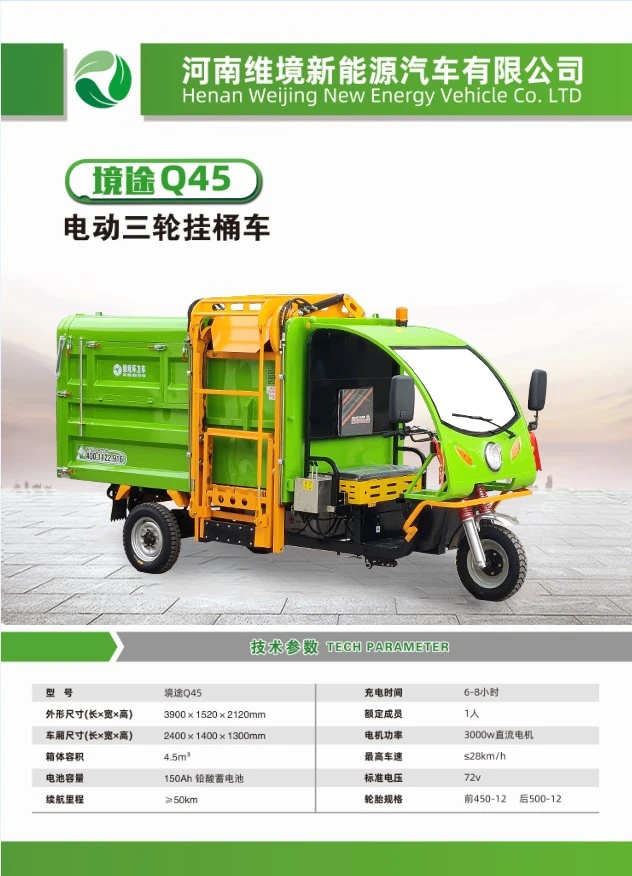 三轮挂桶车 境途Q45 1、半封闭车身流线造型,线条流畅,坚固耐用,新颖美观. 2、挂桶机构只需一人操作即可完成垃圾收集、装卸. 3、采用全封闭箱体结构,可以适应于各种环境下的清运作业需求 .